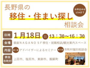 【長野県の移住・住まい相談会】を、1月18日(日曜日) に「銀座NAGANO」にて開催します。